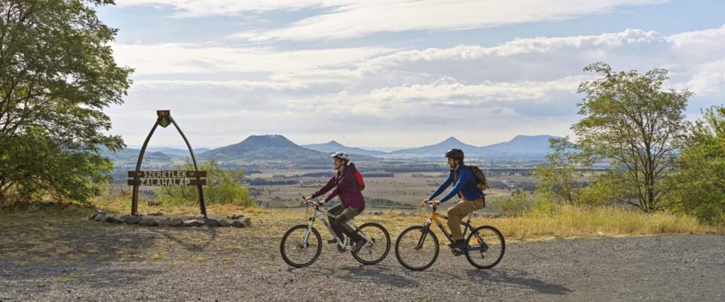 Kihűlt vulkánok hegyként tornyosuló kúpjai, bazaltoszlopokba dermedt idő, magányos sziklák, a falvakban elszórt vörös- vagy épp bazaltkőből faragott kultikus figurák, színes és árnyas erdők, számtalan barlang, gejzírek maradványai, zöldellő szőlőhegyek, patinás pincék, malmok, a nádasok hajnali illata, a siklók és az ég madarai, a parasztbarokk újjászületett épület-remekei, templomtornyok, harangok és levendula mezők, a köztük kanyargó kerékpáros és túrautak külön-külön is megszólítanak, így együtt pedig valami egészen különleges élményt kínálnak.