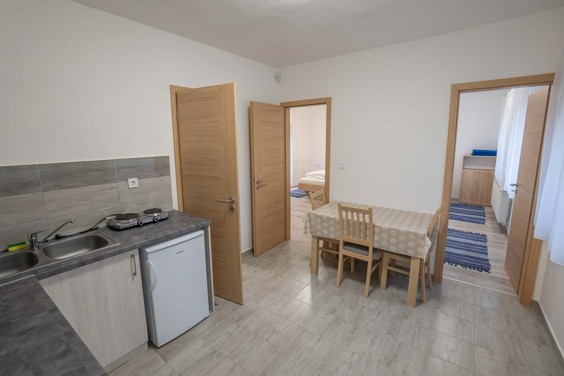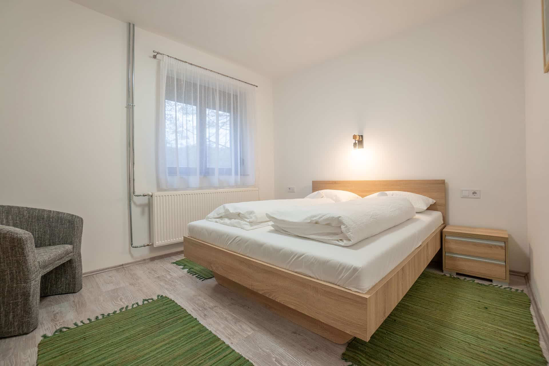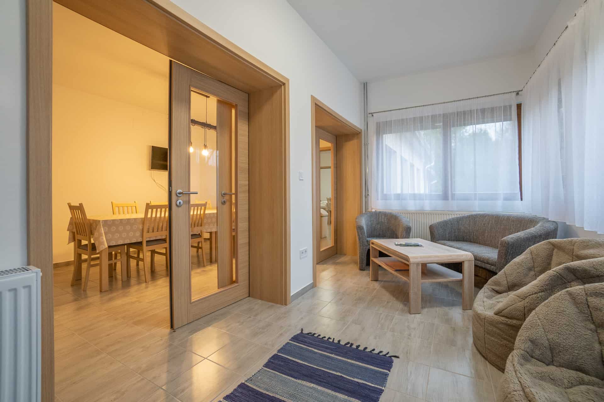 Mindkét apartman két szobával, önellátásra alkalmas saját konyhával, fürdőszobával és külön bejárattal rendelkezik. A kisebb alapterületű apartmanhoz egy erdőre néző fedett terasz, a nagyobbikhoz egy fa nyílászárókkal körbevett, az év minden szakában használható télikert tartozik. Az erdei lak egy, a télikerthez kapcsolódó közösségi helyiséggel is rendelkezik, ahol egyidejűleg elegendő hely biztosított az összes vendég számára. Ideális hely turistáknak, csendes környezetre vágyó családoknak és baráti társaságoknak egyaránt.