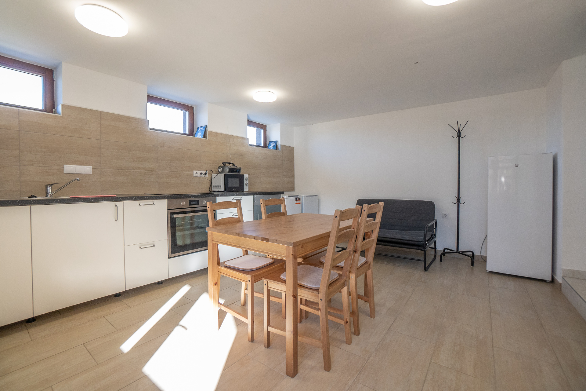 Elektromos fűtés, mosogatógép, mosógép, férfi és női mosdók, zuhanyzók, kinti benti étkező
