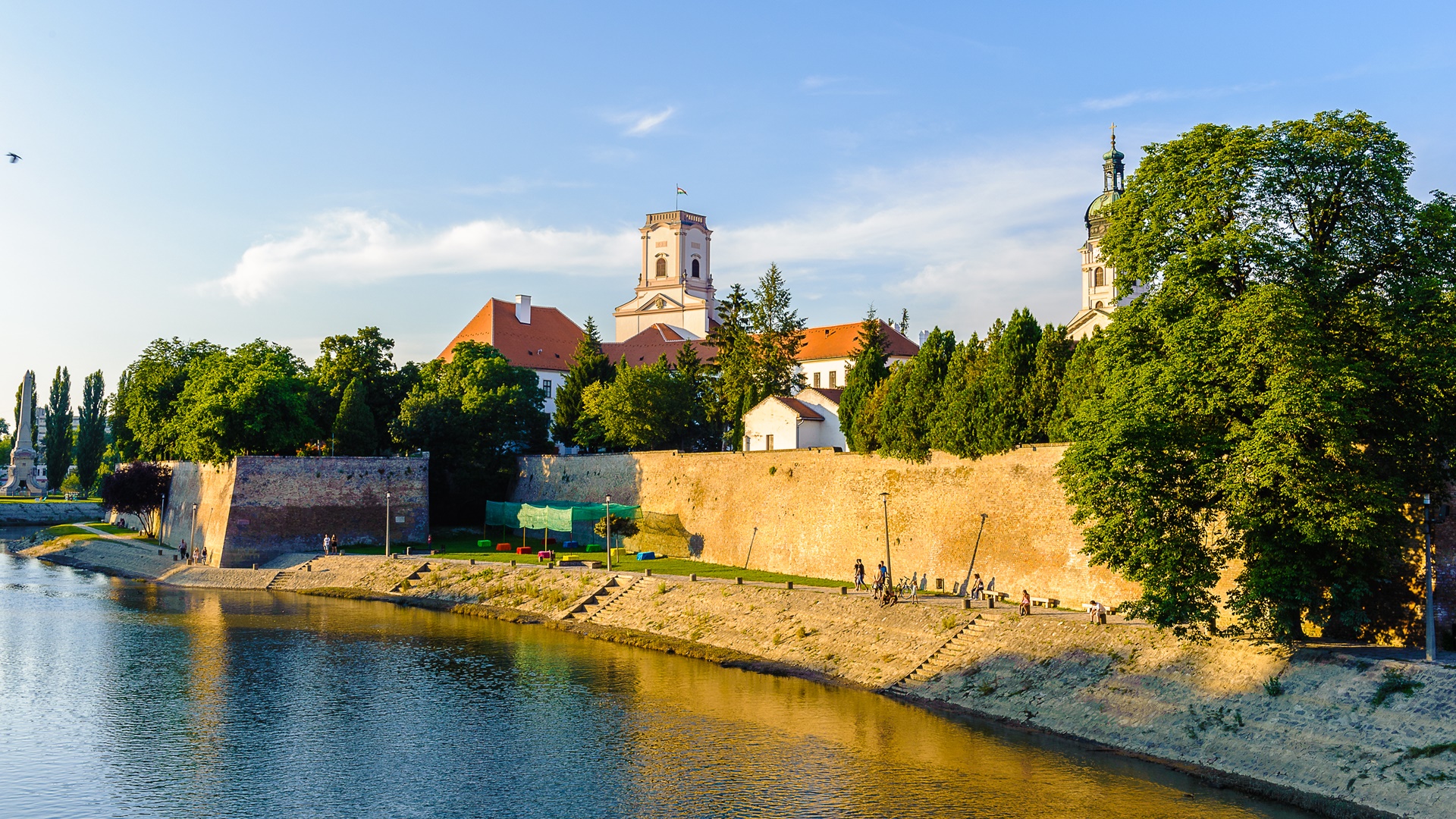 Győr történelmi belvárosának szívéből, az ország egyik legszebb barokk teréről, a Széchenyi térről indítjuk túránkat. A Kazinczy utcán kezdjünk el gurulni, az utca végén már látjuk a sárga színű Karmelita templomot, itt nézzünk körbe, és ha figyelmesek vagyunk a Bécsi kapu téren észreveszünk egy sárga színű épületet, amelynek második emeletén az ablaktáblák mind csukva vannak. Egyszerű az ok: az a szint nem létezik, csak ablaktáblák vannak rajta. Innen gurulunk át az első folyónk felett, a Rába folyik el a lábunk alatt. A hídról csodálatos panoráma nyílik a Püspökvárra és a győri bazilikára. Hídról jobbra fordulunk és hamarosan az árvízvédelmi töltésen tekerünk a Mosoni-Duna partján.