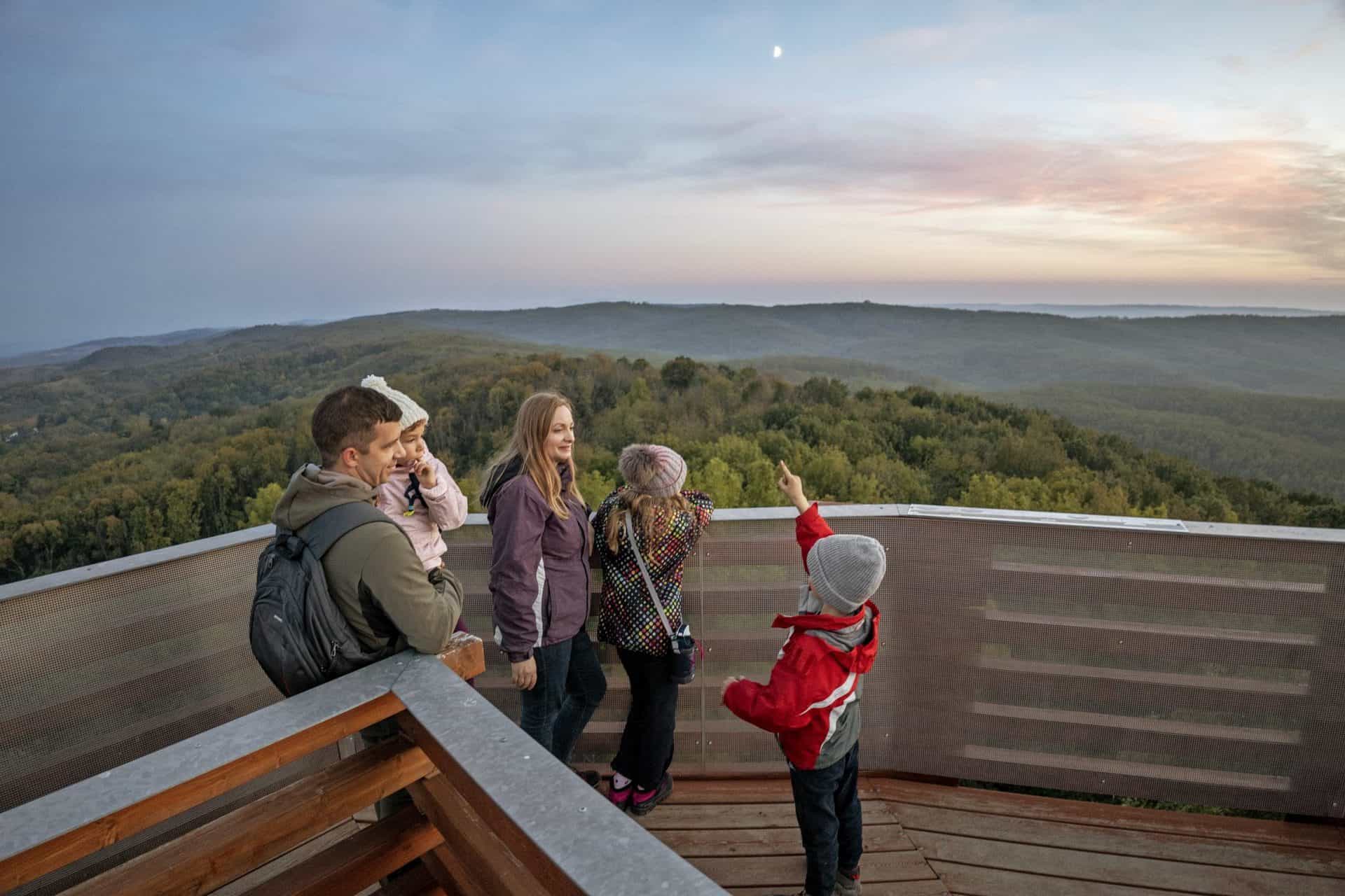 A kilátó megtekintése után túránkat az ösvényen maradva enyhén délnyugat felé folytatjuk. Követjük a piros útjelzéseket kb. 3 kilométeren keresztül, amíg elérünk egy kereszteződéshez, ahol jobbra fordulunk a földúton, északnyugat felé tartunk, a vízszintes zöld sáv jelzések irányába. Kb. 1 kilométer múlva a kereszteződésnél a zöld kereszt jelzéséket követve a földúton haladva kb. 1 km múlva a kereszteződésnél enyhén jobbra fordulunk, a piros kereszt jelzéseket követve a túránk kiinduló pontja felé, azaz a Gyermektábor parkolója felé vesszük az irányt.